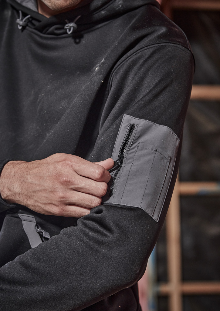 • Contrast arm pocket with zip closure